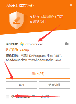 8.当有程序试图访问这个文件夹时,右下角会弹出提示,是否放行 or 拦截,一般 小飞机进程 explorer.exe svchost.exe 等系统进程是需要放行的,其他程序看情况选择。