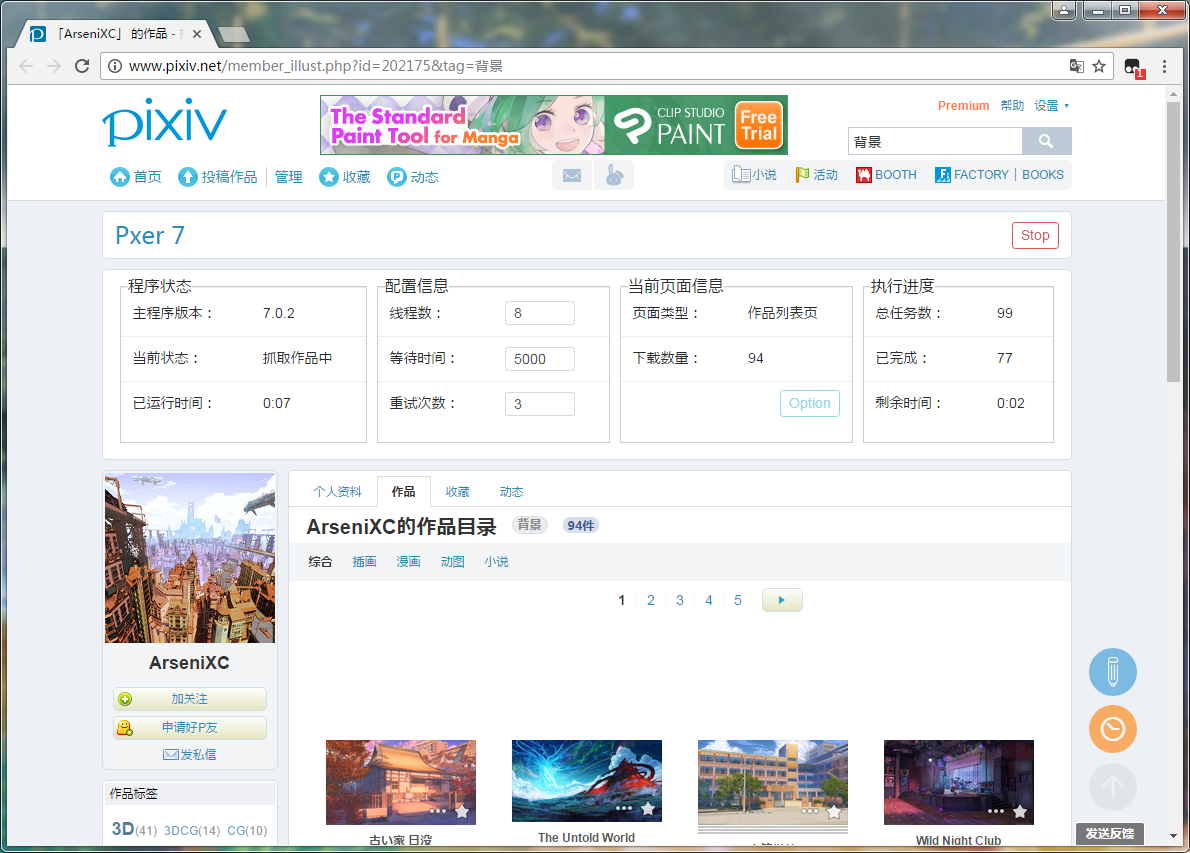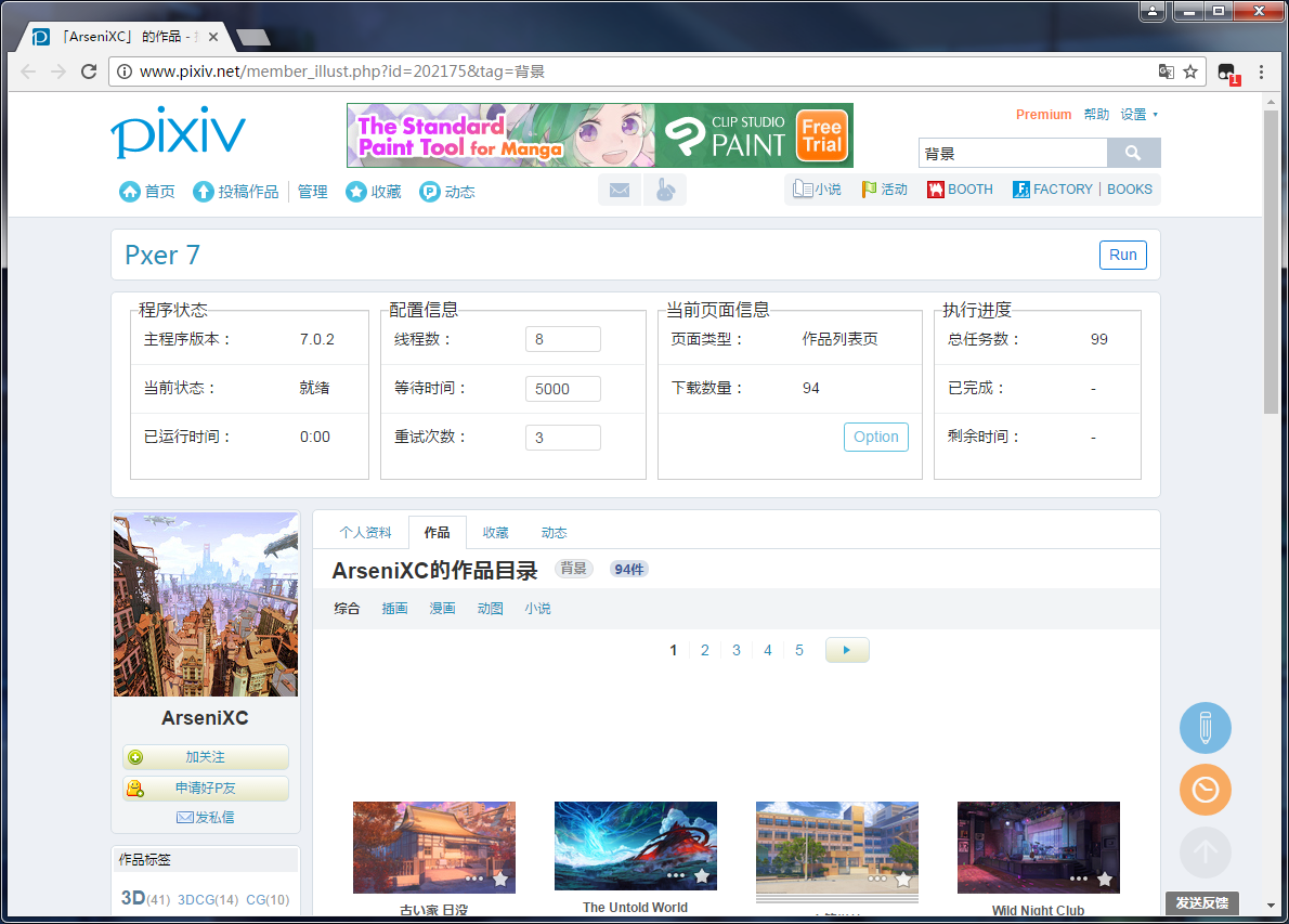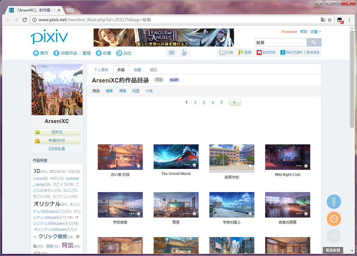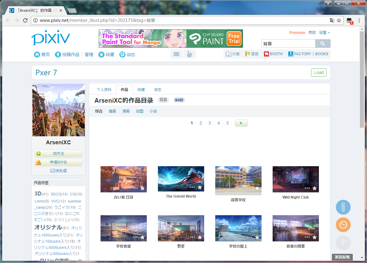 可以看到这位画师共投稿了94副与“背景”相关的插画,这个数量在P站画师投稿数不算多(长逛P站的同学应该知道),但是如果要手动一幅幅保存可能就是一件比较辛苦的事情了。