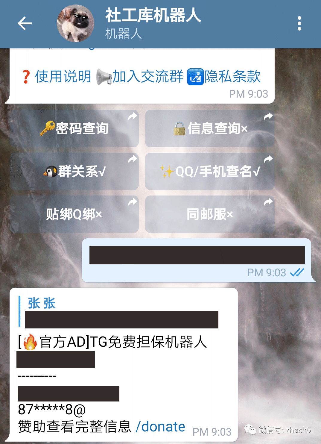 现在我们要查询他的手机号码,我在搜索引擎并没有查询到关于手机号的信息,我尝试着用Telegram的社工库查询接口对他的生活进行查询
